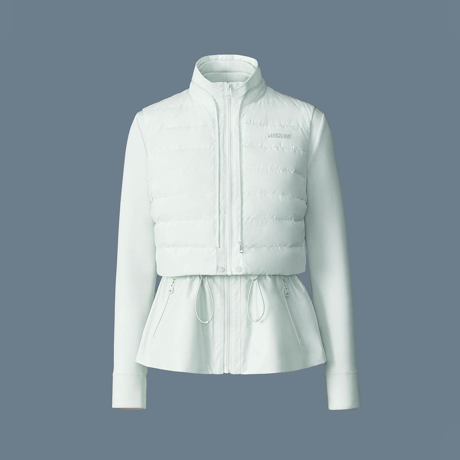 薄手でも防寒力が高く、タイトなシルエットでも窮屈感のないマルチウェイストレッチが、ダウンでスタイルアップを実現。高い位置にウエストを設定し、リブ素材でキュッと絞ったデザインは、着る人の腰回りを美しく演出してくれる、今回も大ヒット間違いなしの新デザイン。センターフロントファスナーはダブルジップ、スタイリングに合わせられる機能性もファッション性も抜かりなし!
