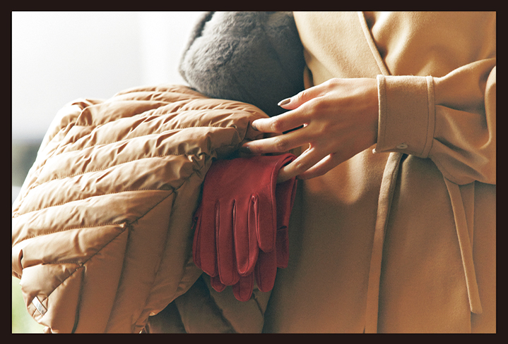 ノーカラーキャメルロングダウンコート¥240,900シャツ¥141,900パンツ¥64,900エコファーベルトバッグ¥132,000(すべてヘルノ/ヘルノ・ジャパン)グローブ¥27,500[参考価格](アルポ/アマン)ピアス¥115,000(シャルロット シェネ/エドストローム オフィス)