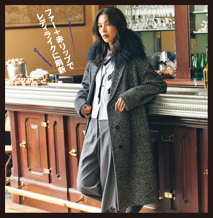エコファーコート¥149,600スカーフ*参考商品(ともにヘルノ/ヘルノ・ジャパン)ピアス¥15,400(カラ・ユ/ショールーム ロイト)ブーツ/スタイリスト私物