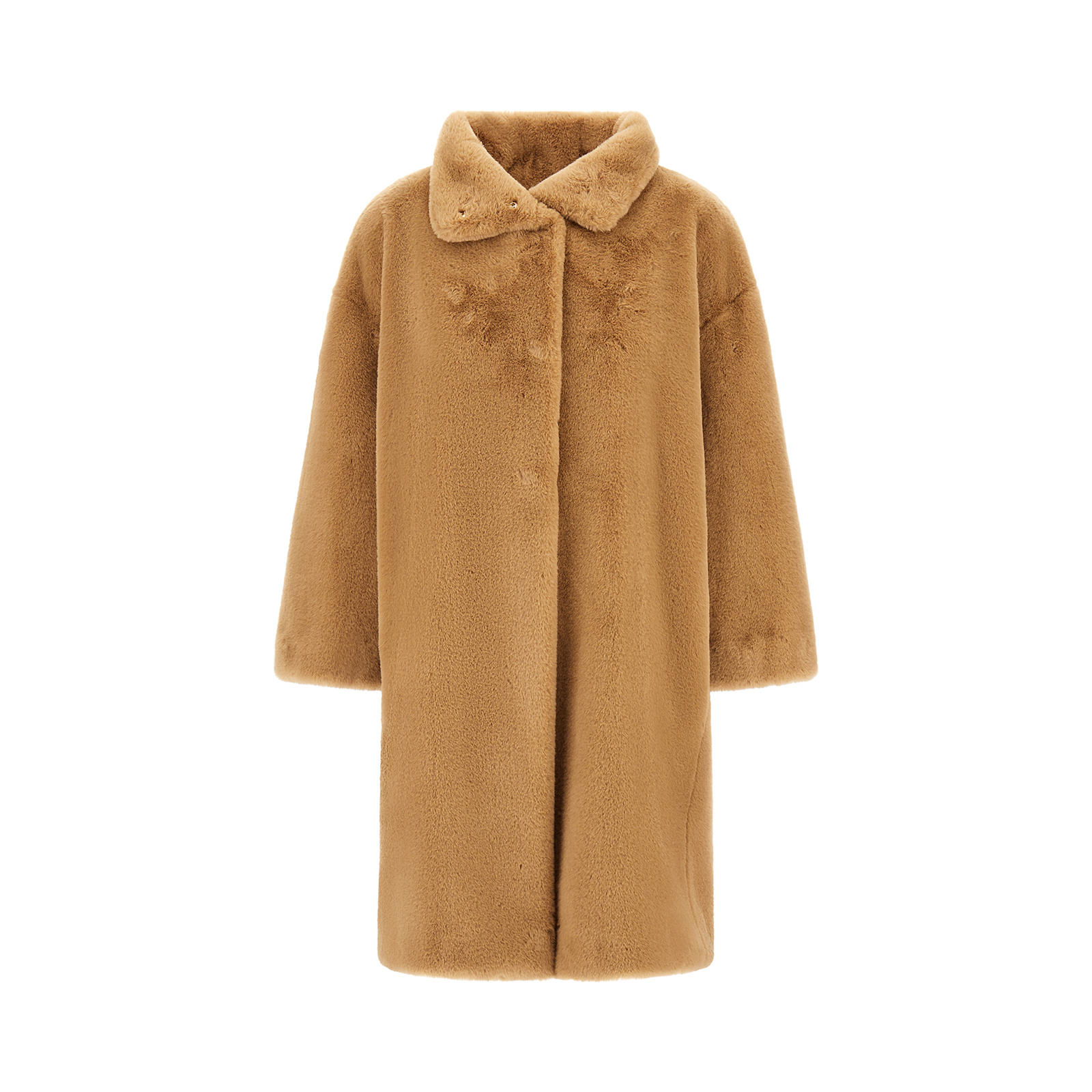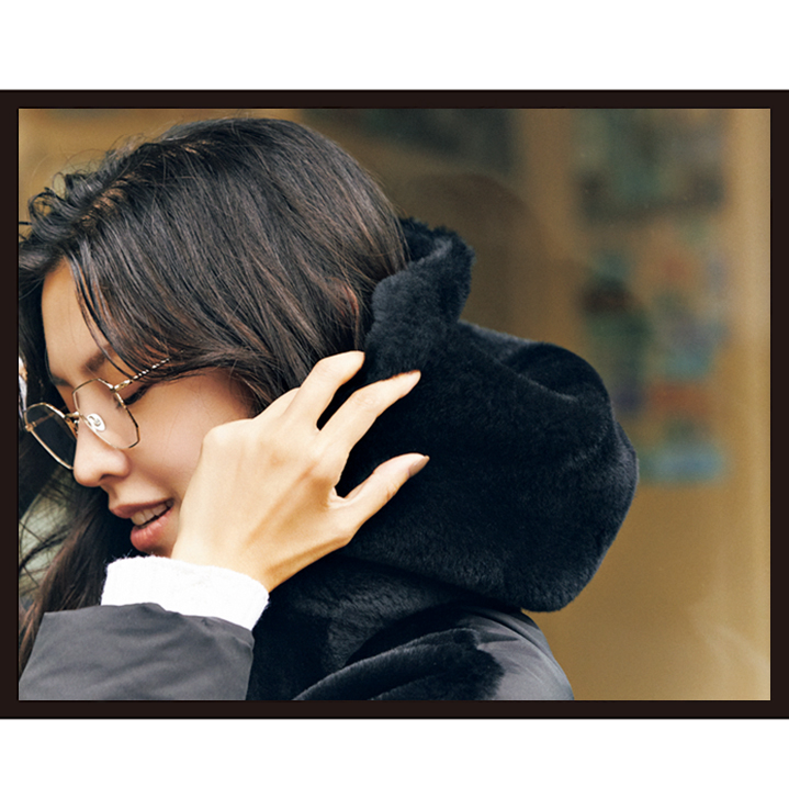 NOTゴージャス&毛の抜けにくさもマナー上手。とにかく肌触りなめらかで時代に合ったエコファーアウターは、ヘルノの人気アイテムに定着。衿元を折り返すと表情が変わる一着は、ライニングには同色の“Hモノグラム”が。