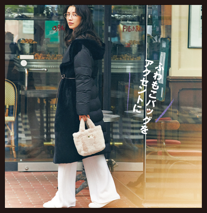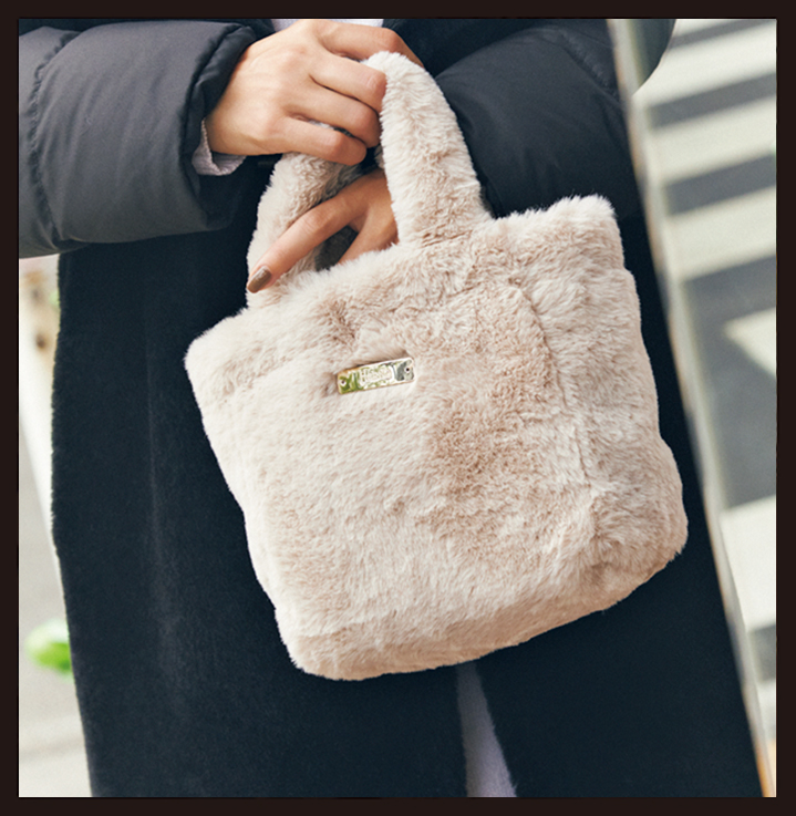 エコファー素材のふわもこバッグの新作も登場。ふわふわの優しい手触りと、コロンとしたフォルムが心くすぐるミニトートはカンバセーションピースにもなる存在感。クロスボディ用の共布ストラップとナイロンキルティングポーチ付き。