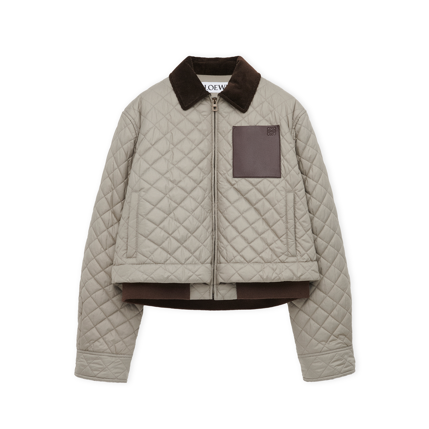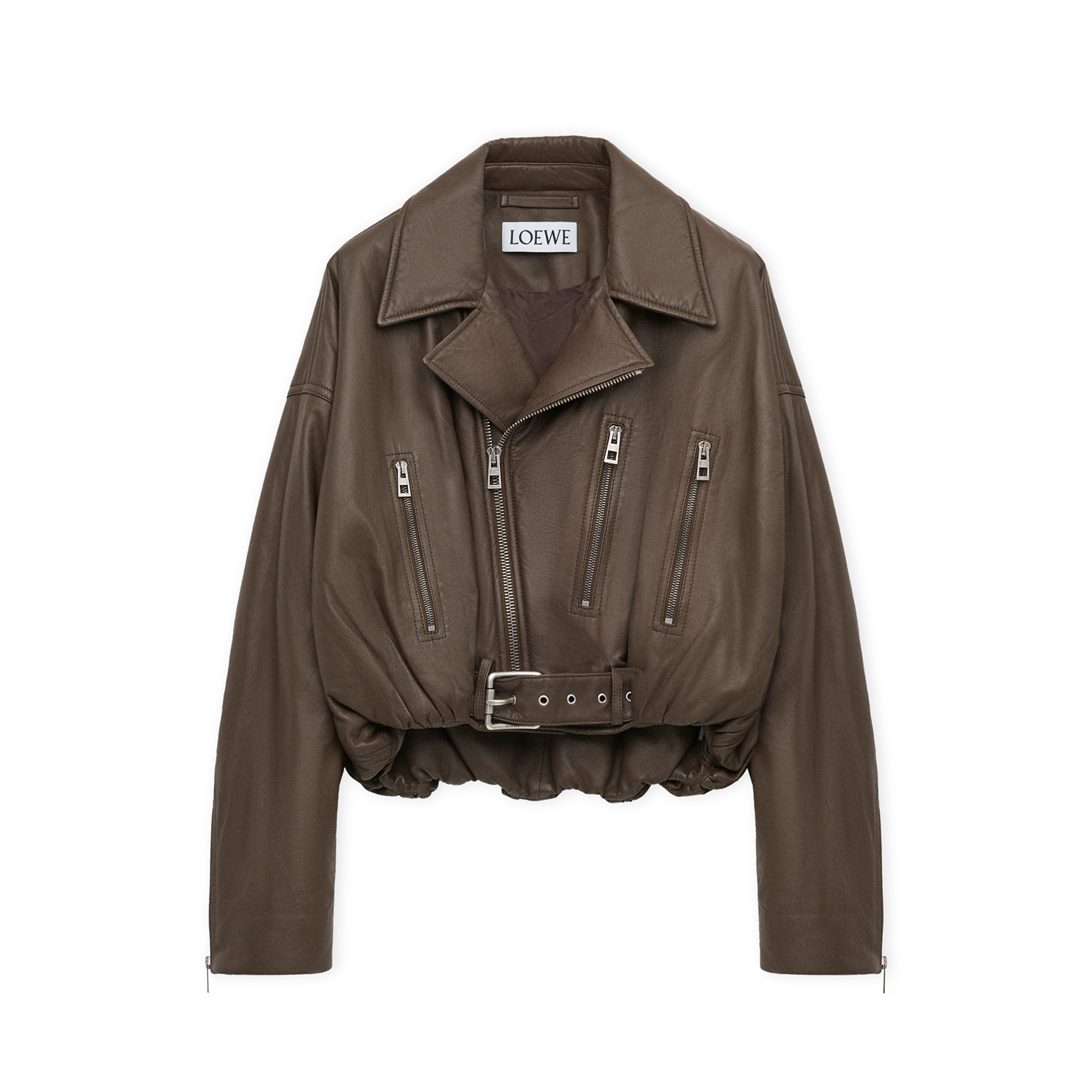 しなやかなナパラムスキンを用いた、艶やかさと驚くほどの軽さが魅力。身頃のジップやバックルベルトなどバイカーディテールをロエベらしいバランスで表現。背中にはLOEWEのエンボス加工入りレザーパッチが。