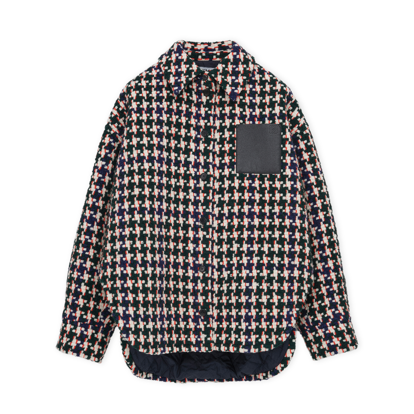 クラシカルなハウンドトゥース柄を鮮やかなカラーリングで仕上げた更新型のオーバー シャツ。エンボス加工のアナグラムが配されたレザーポケットがシャープなアクセント。ムラ加工を施した技ありなワイドレッグジーンズにも注目♡