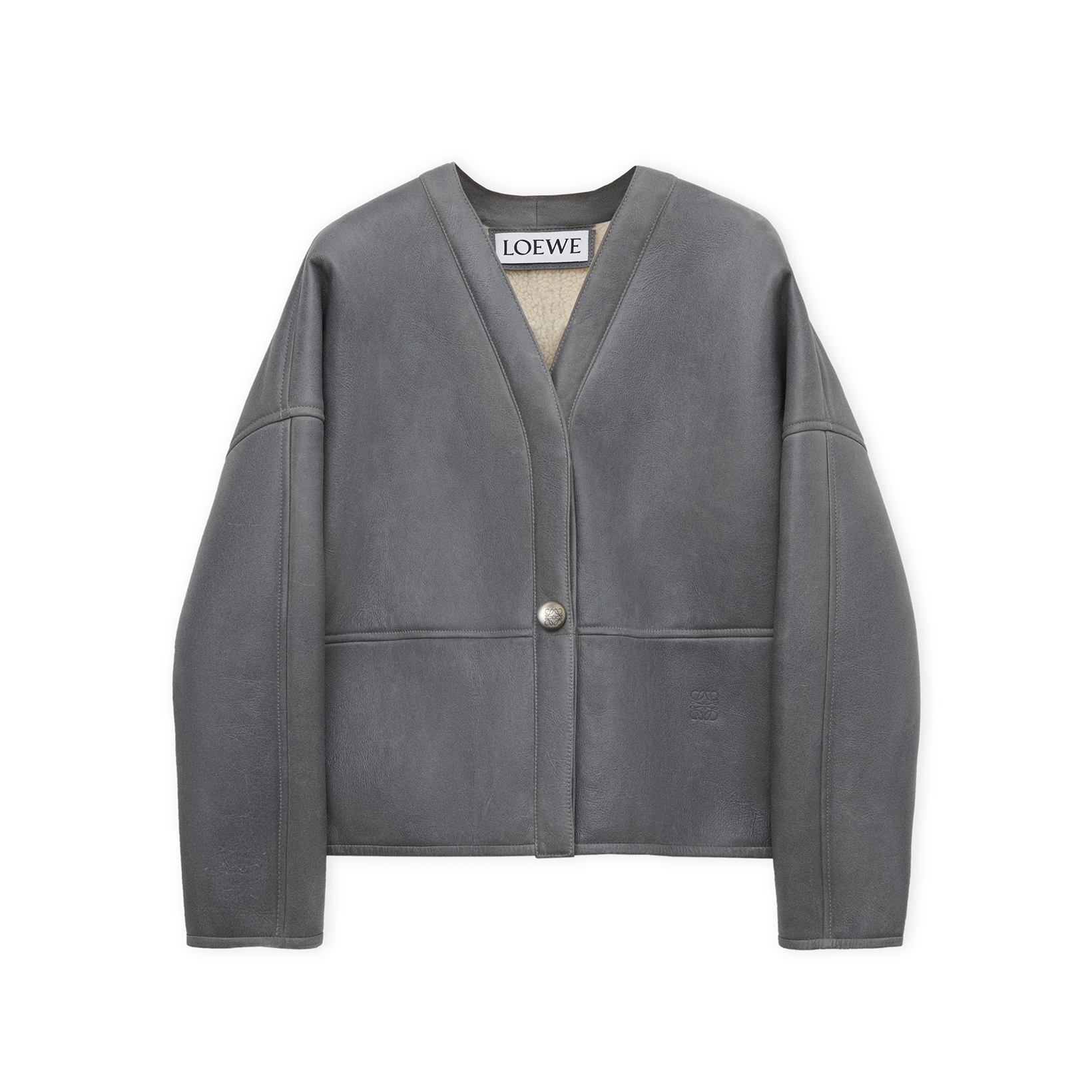 カーリーメリノシアリングを用いたカーディガンデザインのアウターは、首元をスッキリ見せるVネックとニュアンスグレーの色味がスタイリッシュ。取り外し可能なシルバーの〝ペブル〟ボタンも、ロエベらしい遊び心。