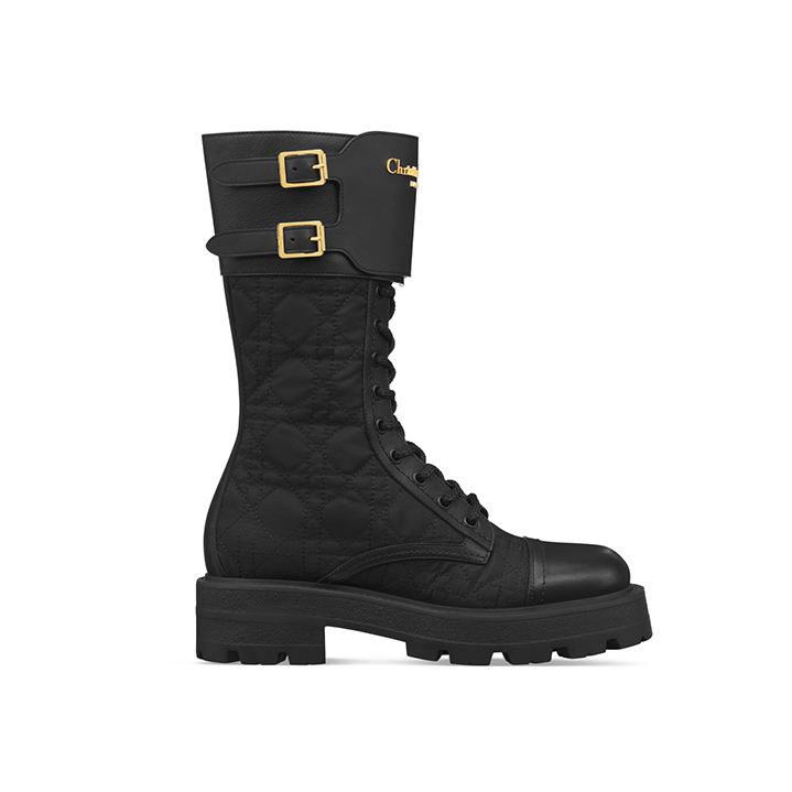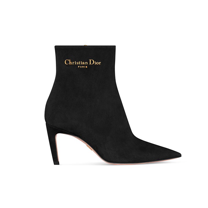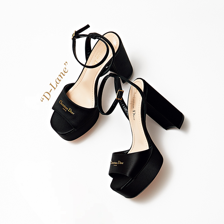 ブラックサテンのアッパーに〝Christian Dior Paris〟のシグネチャーをゴールドトーンメタルでセット。プラットフォームのボリューム感でバランスアップを叶えつつ、デニムの足元に色っぽさをプラス。