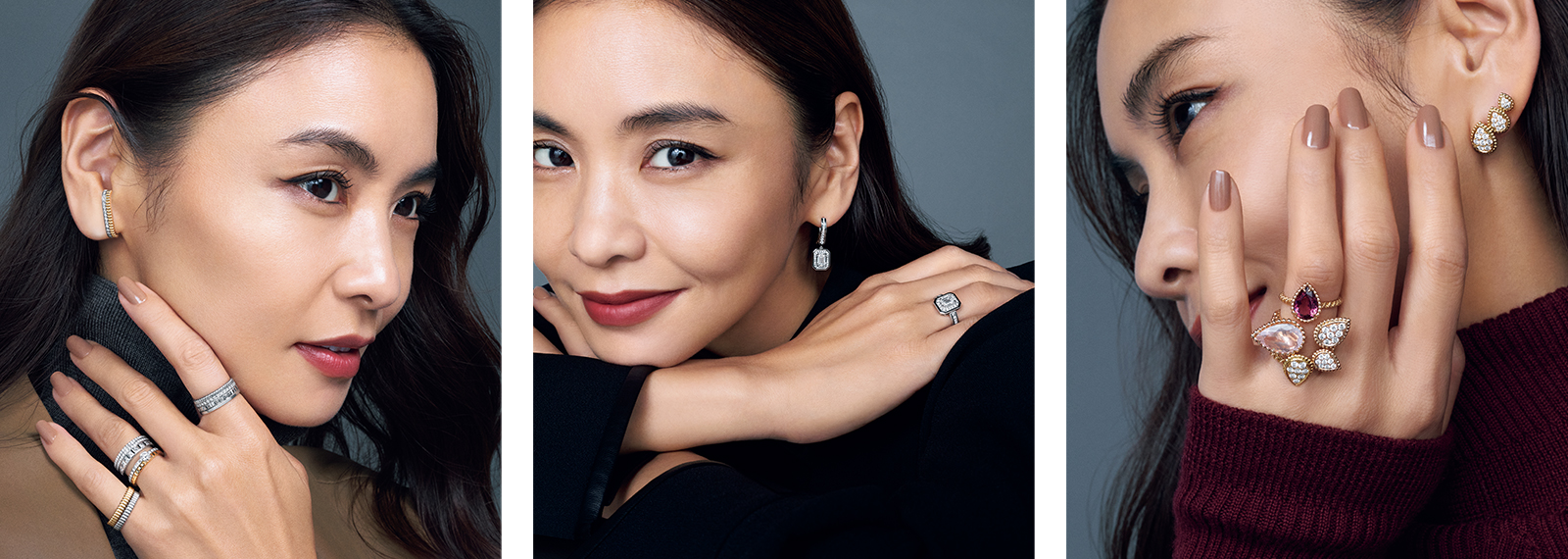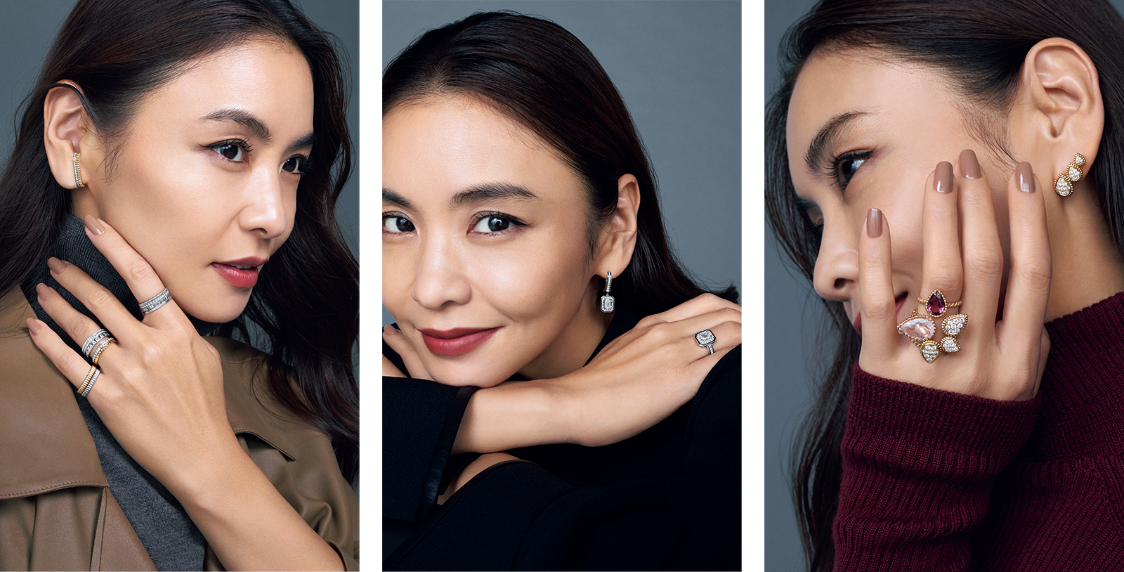 「キャトル」イヤリング[YG×WG×DIA]¥726,000リング[人差し指][WG×DIA]¥1,346,400[薬指上][WG×DIA]¥2,917,200[薬指下][YG×WG×DIA]¥847,000~[小指上][YG]¥266,200[小指下][WG]¥292,600※すべて予定価格(すべてブシュロン/ブシュロン クライアントサービス)コート¥297,000(ロゥタス/ロゥタスカスタマーサービス)タートルニット/スタイリスト私物