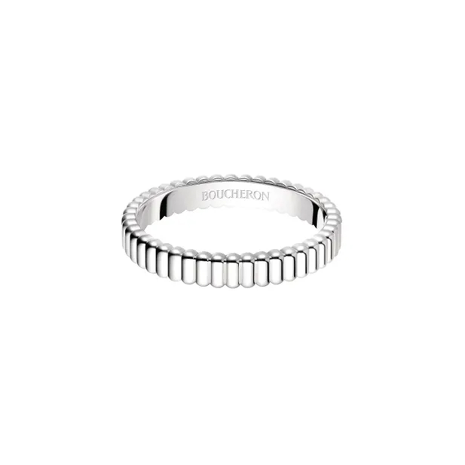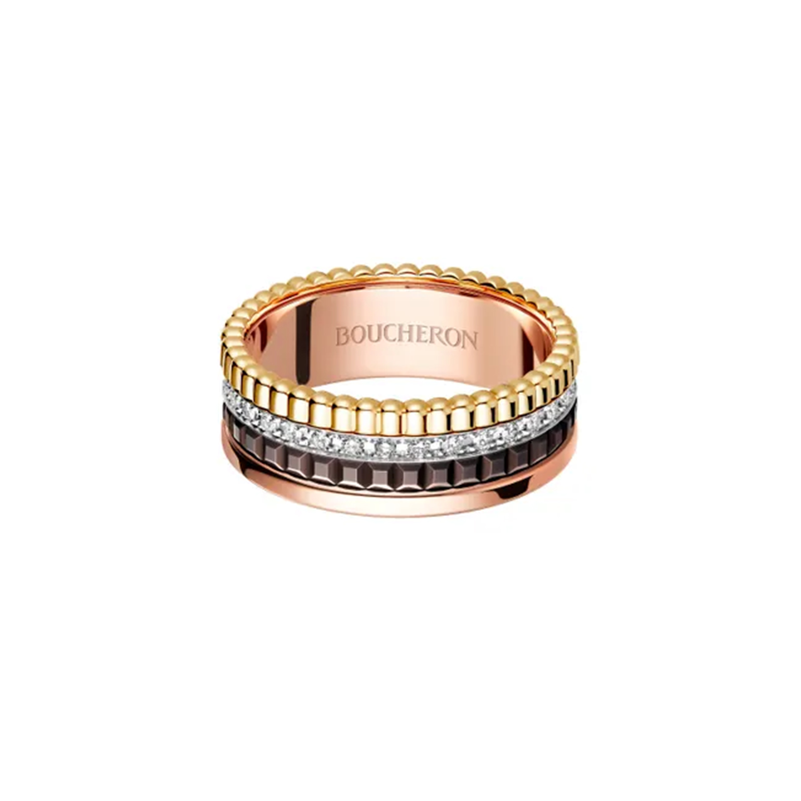 八角形のフォルムは、ハイジュエラーとしてブシュロンが初めてブティックを構えた、パリ・ヴァンドーム広場に着想を得たもの。ダイヤモンドを縁取るブラックラッカーのラインが際立つ、ミニマムでタイムレスな名作。