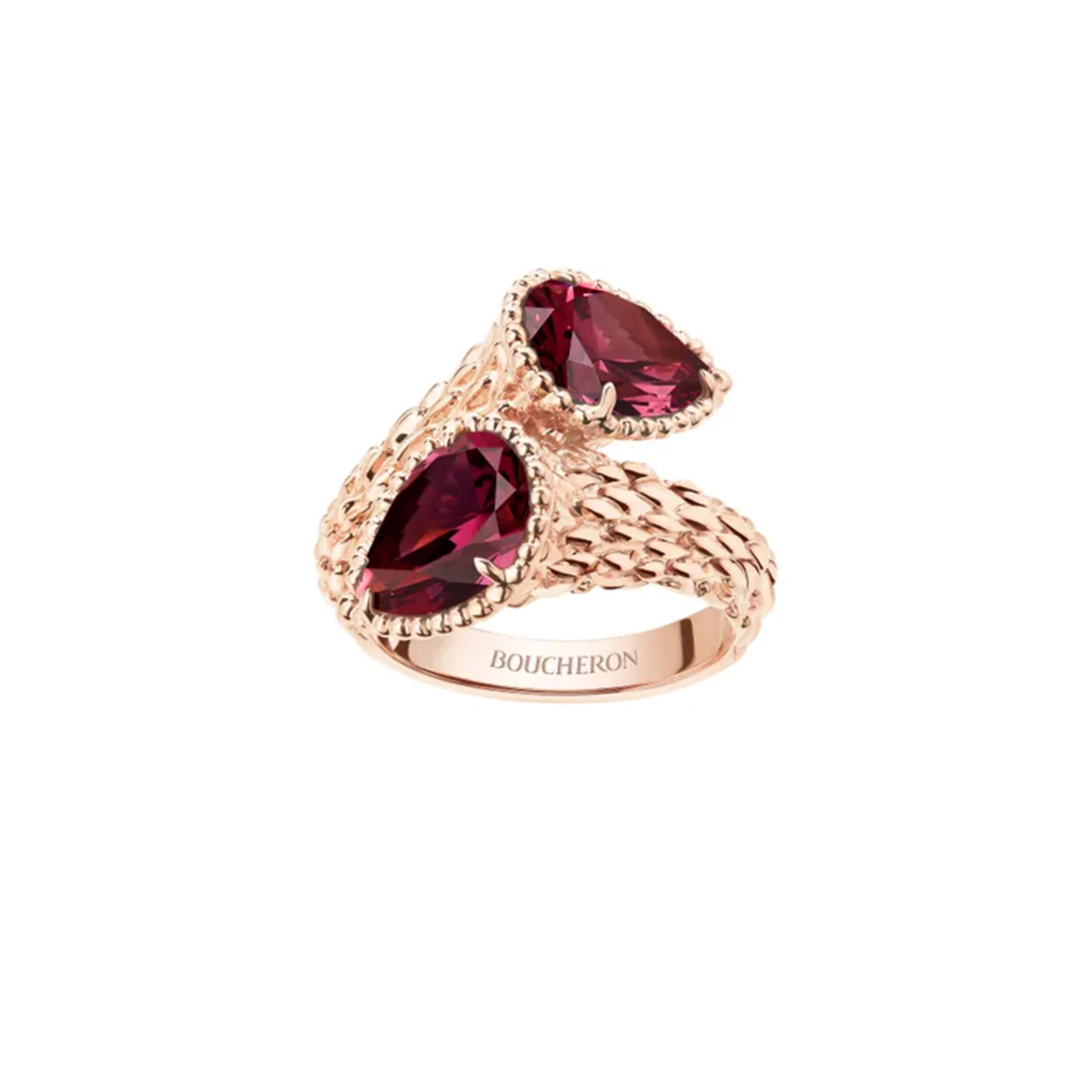 「セルパンボエム」イヤリング[YG×DIA]¥1,821,600リング[上][PG×ロードライトガーネット]¥360,800[中央][PG×ピンククオーツ×DIA]¥1,518,000[下][YG×DIA]¥726,000※すべて予定価格(すべてブシュロン/ブシュロン クライアントサービス)タートルニット/スタイリスト私物