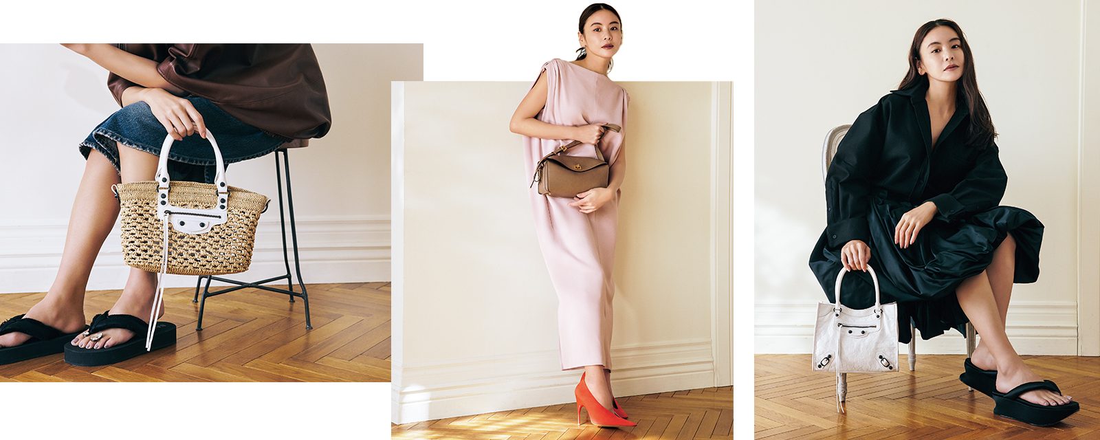 バッグ「ル・シティ バスケット スモール」[W27×H20×D11㎝]〈取り外し可能なストラップ付き〉¥163,900※3月25日よりイベントにて先行発売 サンダル¥123,200トウリング¥81,400※すべて予定価格(すべてバレンシアガ/バレンシアガクライアントサービス)