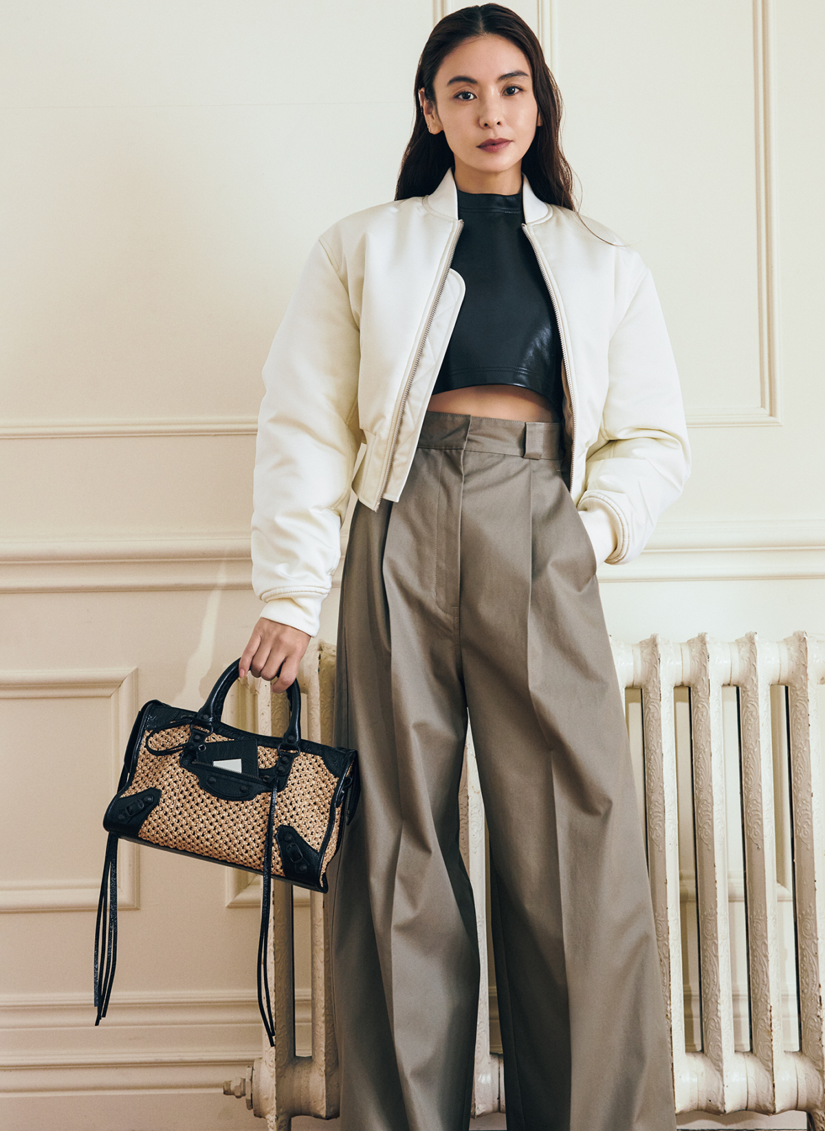 アーカイブのバルーンシルエットから着想を得たパンツは、張り感のあるダブルコットンのシャツに合わせて。スタッズやジップなどの装飾でロックなムードを醸すル・シティのバッグでモードなスパイスをひと匙。ミニサイズのホワイトは日本限定カラー。