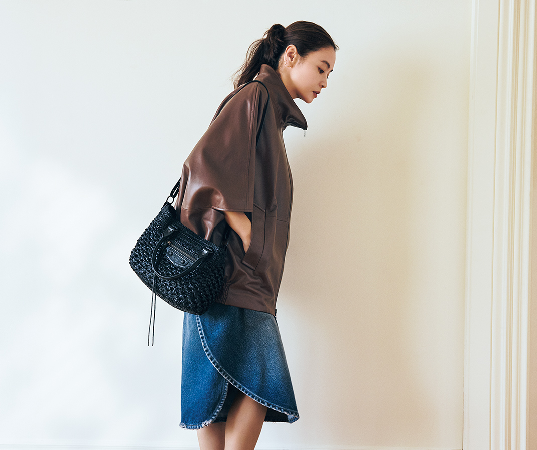 包み込まれるようなボリューム感のあるレザージャケットに、チューリップシルエットのデニムバミューダを合わせて。これに添えるバッグは軽やかなラフィア素材が正解。レザーや金具など異なる質感の素材を重ねたオールブラックカラーは、日本限定。