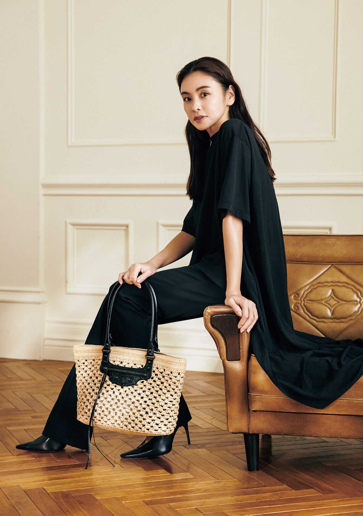 バッグ「ル・シティ バスケットミディアム」[W33×H24×D15㎝]¥192,500※3月25日よりイベントにて先行発売 トレーンTシャツ¥198,000パンツ¥198,000パンプス[参考カラー]¥177,100※すべて予定価格(すべてバレンシアガ/バレンシアガ クライアントサービス)