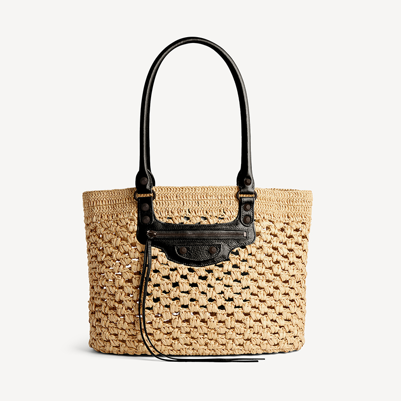 スタッズやバックルなどル・シティの核となるタフなデザインに、ナチュラルなラフィア素材を合わせた意外性に心惹かれる。デニムやトングサンダルなどリラクシーな装いにも調和。