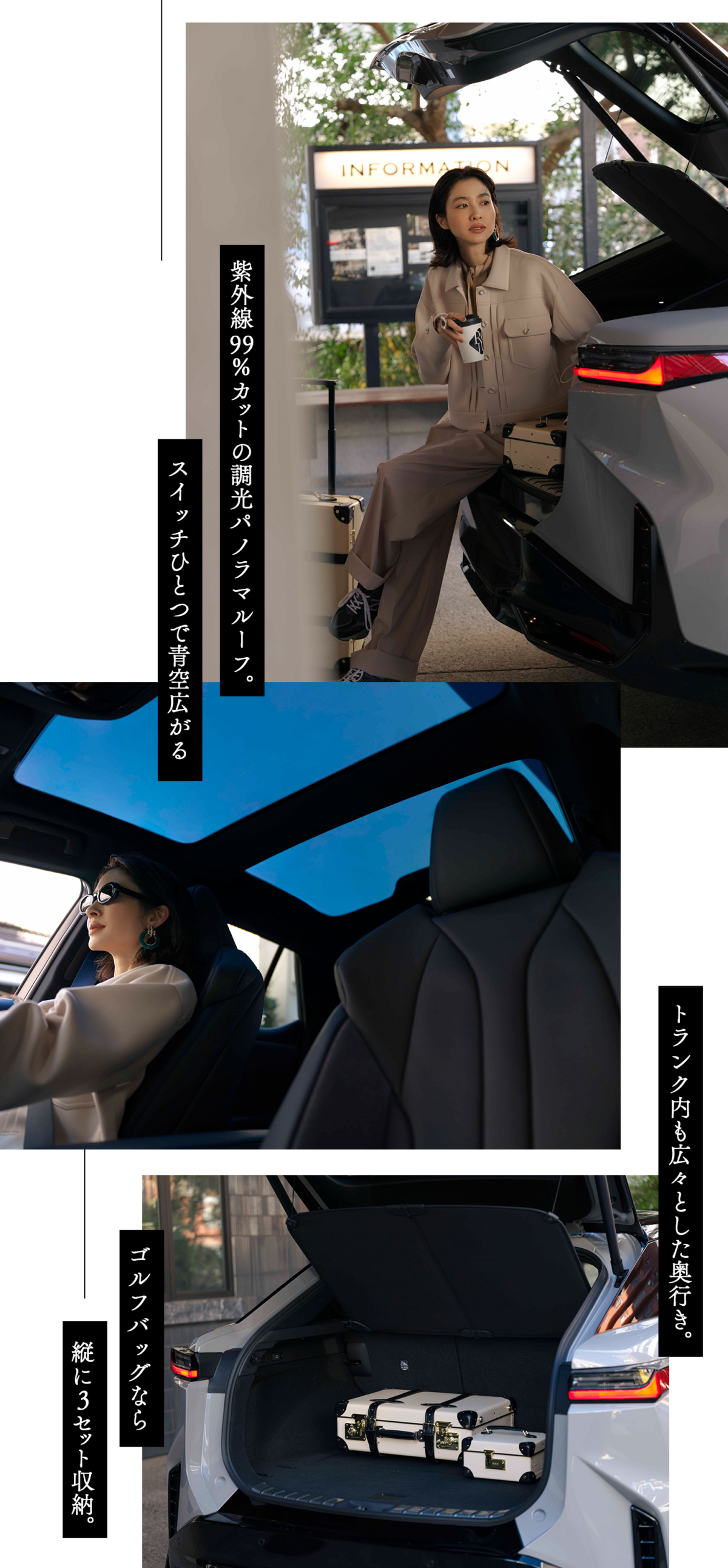 室内広々のリュクスなインテリア、スマートな操作性、疲れにくい快適な乗り心地。どこか遠くへ遊びに行きたくなる、最高の相棒となりそうなレクサス「RZ」。さらに乗ってみると驚くのが、その静かさ。走行感を味わう音は残しつつ、ノイズをなくすというレクサスのこだわりが、ドライブを上質な時間に。運転しやすいボディサイズなのに、後部座席やラゲッジも広々。「子どもたちも伸び伸びドライブを楽しめそうです」by絵美里さん。