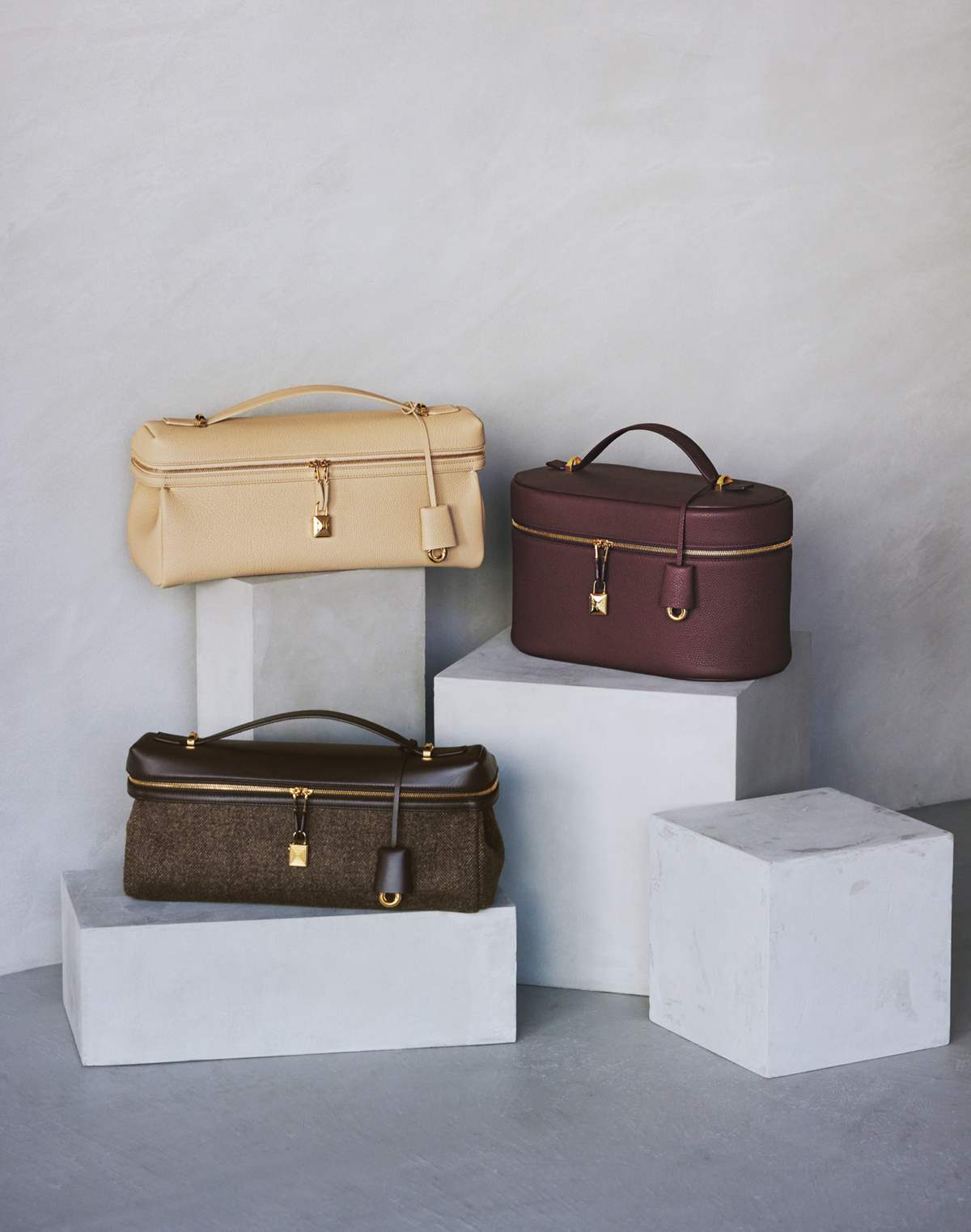 バッグ[右]「エクストラ・ソフティ・ケース」[H18×W30×D14㎝]¥709,500[左上]「エクストラ・ソフティ・バッグ」[H14×W33×D9㎝]¥690,800[左下]「エクストラ・ソフティ・バッグ」[H14×W33×D9㎝]¥765,600(すべてロロ・ピアーナ/ロロ・ピアーナ ジャパン)