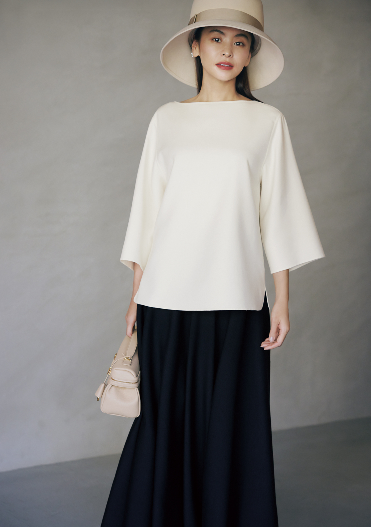 極上素材を用いたカットソーはゆったりとしたボクシーシルエットに、端正なバトーネックが麗しい。ウールシルクの糸を用いたニットスカートを合わせたらひと味違う洗練シンプルに。