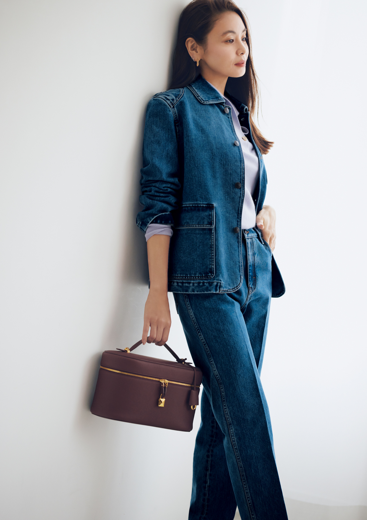 ジャケット¥448,800セーター¥280,500パンツ¥225,500バッグ「エクストラ・ソフティ・ケース」[H18×W30×D14㎝]¥709,500ゴールドのイヤリング¥103,400(すべてロロ・ピアーナ/ロロ・ピアーナ ジャパン)その他/スタイリスト私物