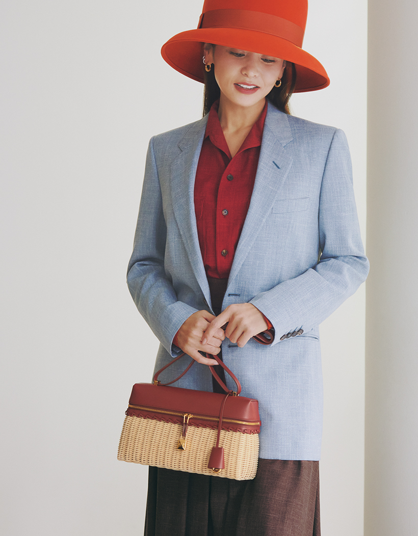 バッグ「エクストラ・バッグ」[H16×W27×D10㎝]¥1,288,100ジャケット¥634,700シャツ¥224,400スカート¥317,900ハット¥466,400ゴールドのイヤリング¥103,400(すべてロロ・ピアーナ/ロロ・ピアーナ ジャパン)その他/スタイリスト私物
