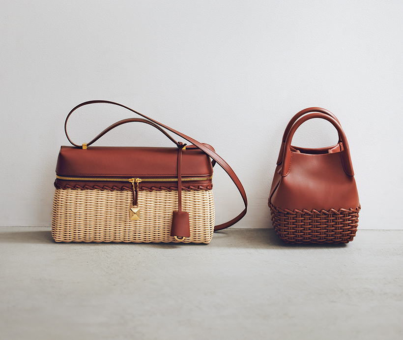 [右]カシミアの原毛の保存に用いられる袋に着想を得たベイル・バッグをコンパクトサイズに。シームレスなデザインに熟練の職人技を凝縮。[左]手編みのウィッカーとレザーのコンビで名作のエクストラ・バッグを表現。