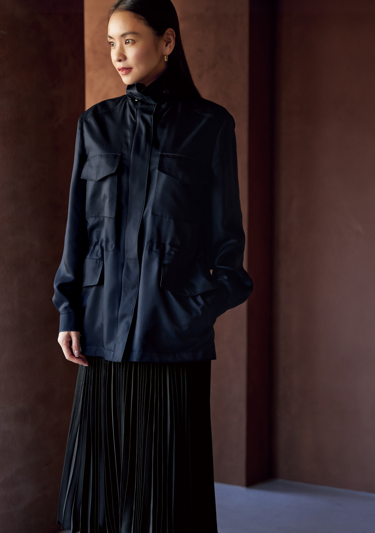ニュー・オーガンジー・シルク・ファブリックの艶やかな素材感で、4つポケットが目をひくミリタリーデザインのジャケットもどこか優美なイメージに。レディシックなプリーツスカートを合わせたら、コンテンポラリーさとタイムレス感のいいとこ取りを実現。