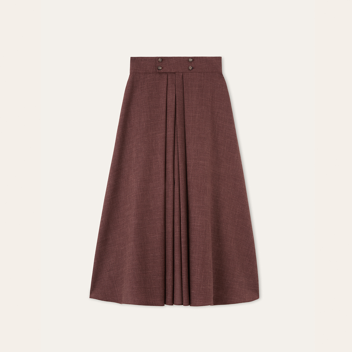 ウールシルクリネンのジャケットにスカートを合わせたモードな装いに、ウィッカーバッグで抜け感を。ブラウン系コーデにもバッグのナチュラルトーンがマッチ。