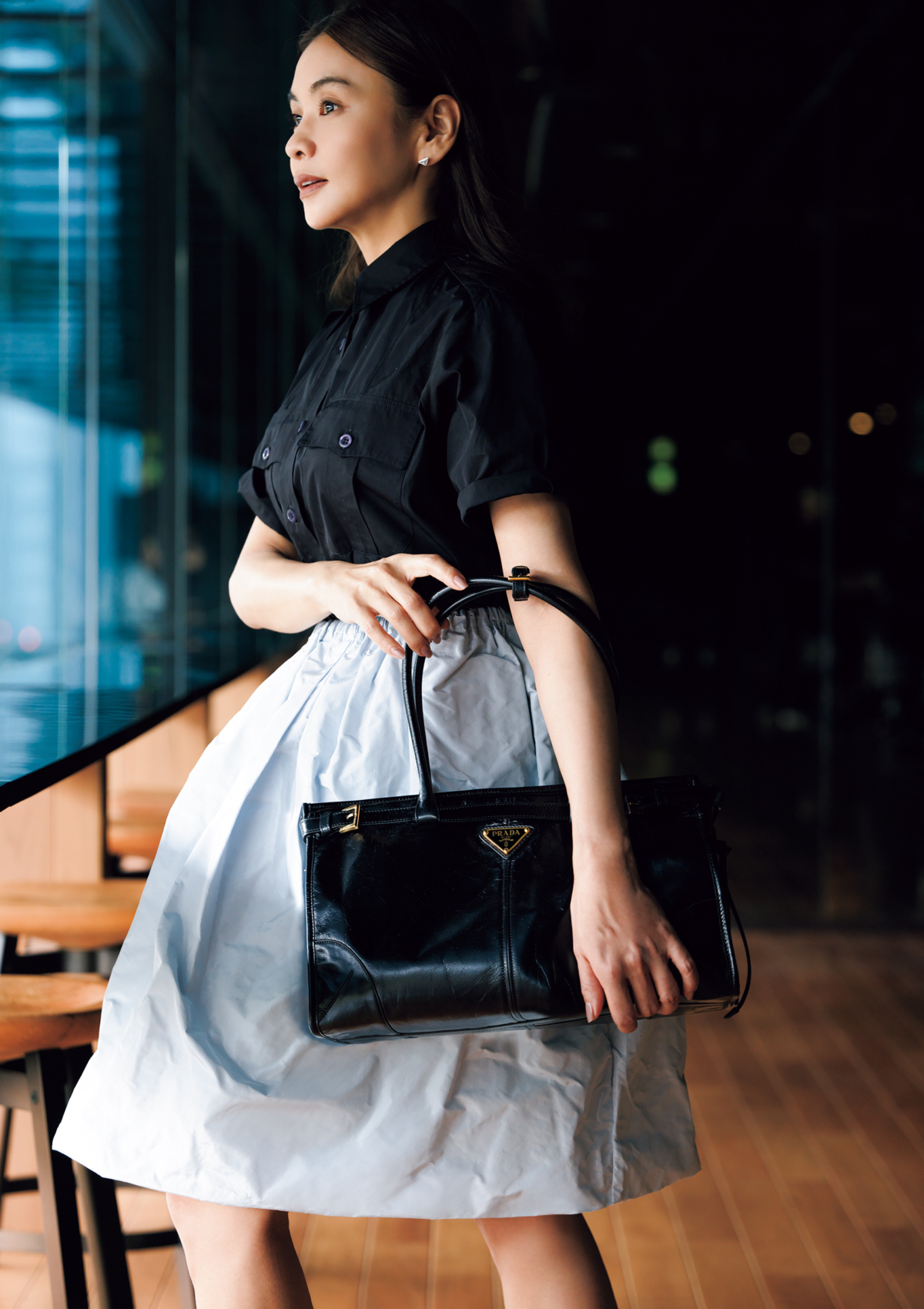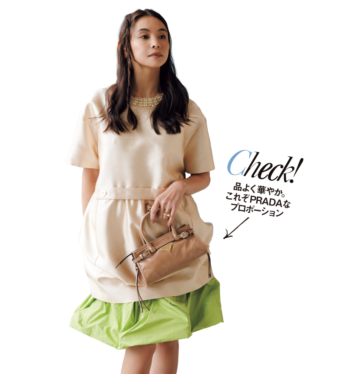 モダンかつエレガント。PRADAの美学はそのままに、タブレットが入る実用性も備えるサイズ感。ふんわりボリューミーなタフタスカートに、BIG BAGをピタッと抱え持つバランスが新しい。