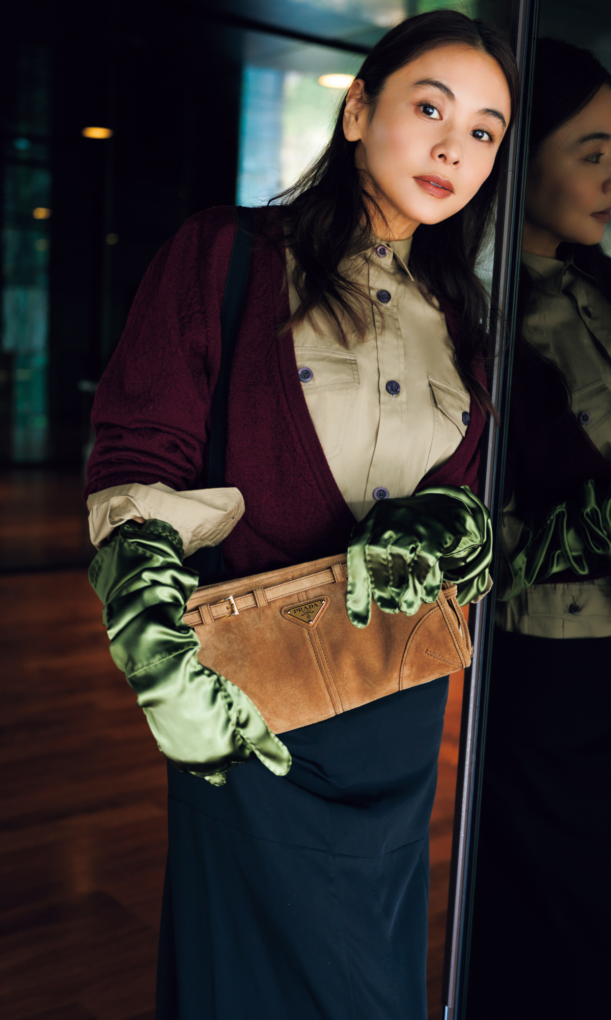 バッグ「プラダ ボニー〈スモール〉」[H14×W26×D12㎝]¥407,000ニット¥357,500シャツ¥214,500スカート¥308,000サテングローブ¥352,000※すべて予定価格(すべてプラダ/プラダ クライアントサービス)
