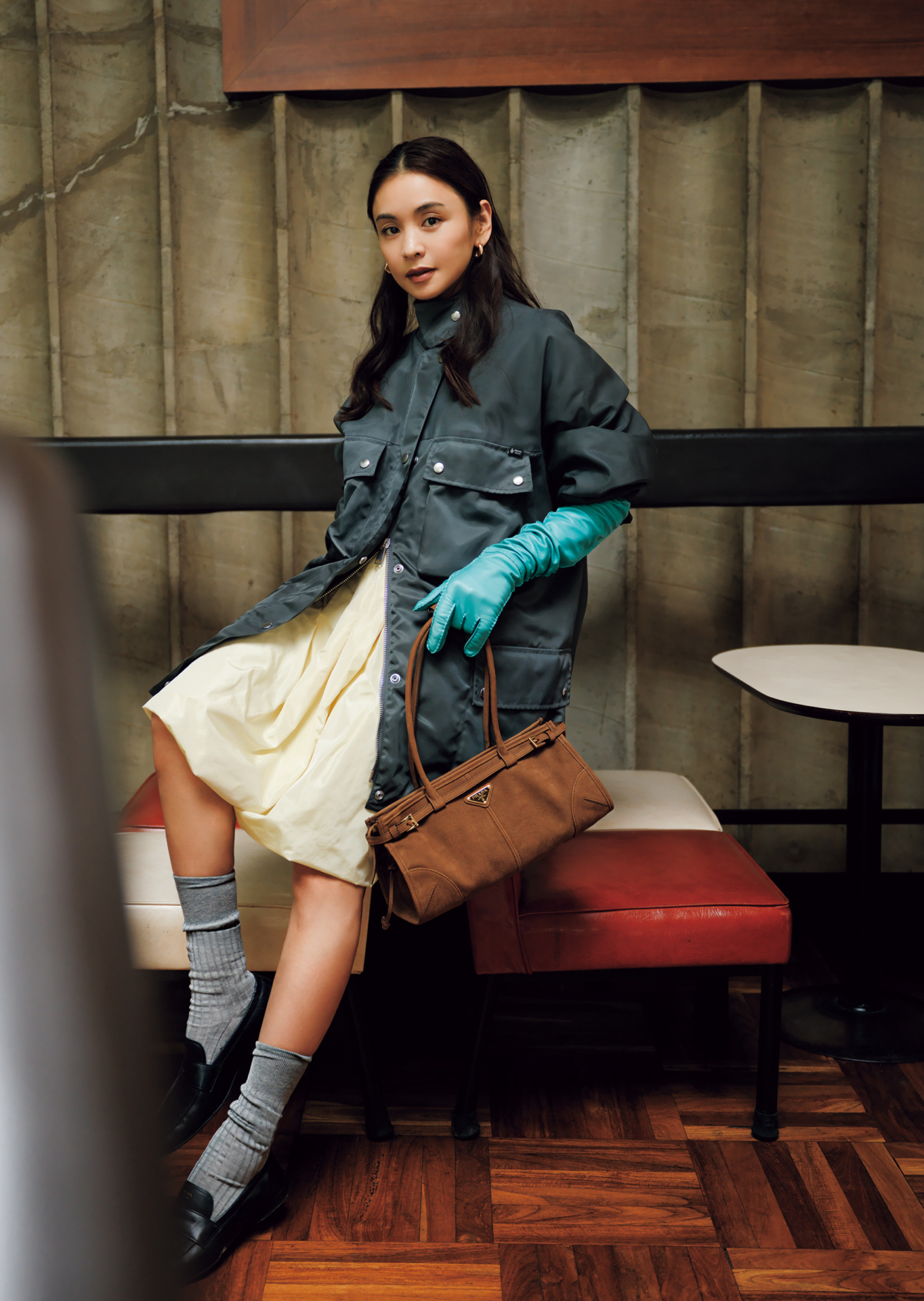 バッグ「プラダ ボニー〈ミディアム〉[」H 15.5×W32×D12㎝]¥495,000ジャケット¥847,000スカート¥500,500レザーグローブ¥203,500ローファー¥165,000ピアス¥957,000※すべて予定価格(すべてプラダ/プラダ クライアントサービス)ソックス/スタイリスト私物