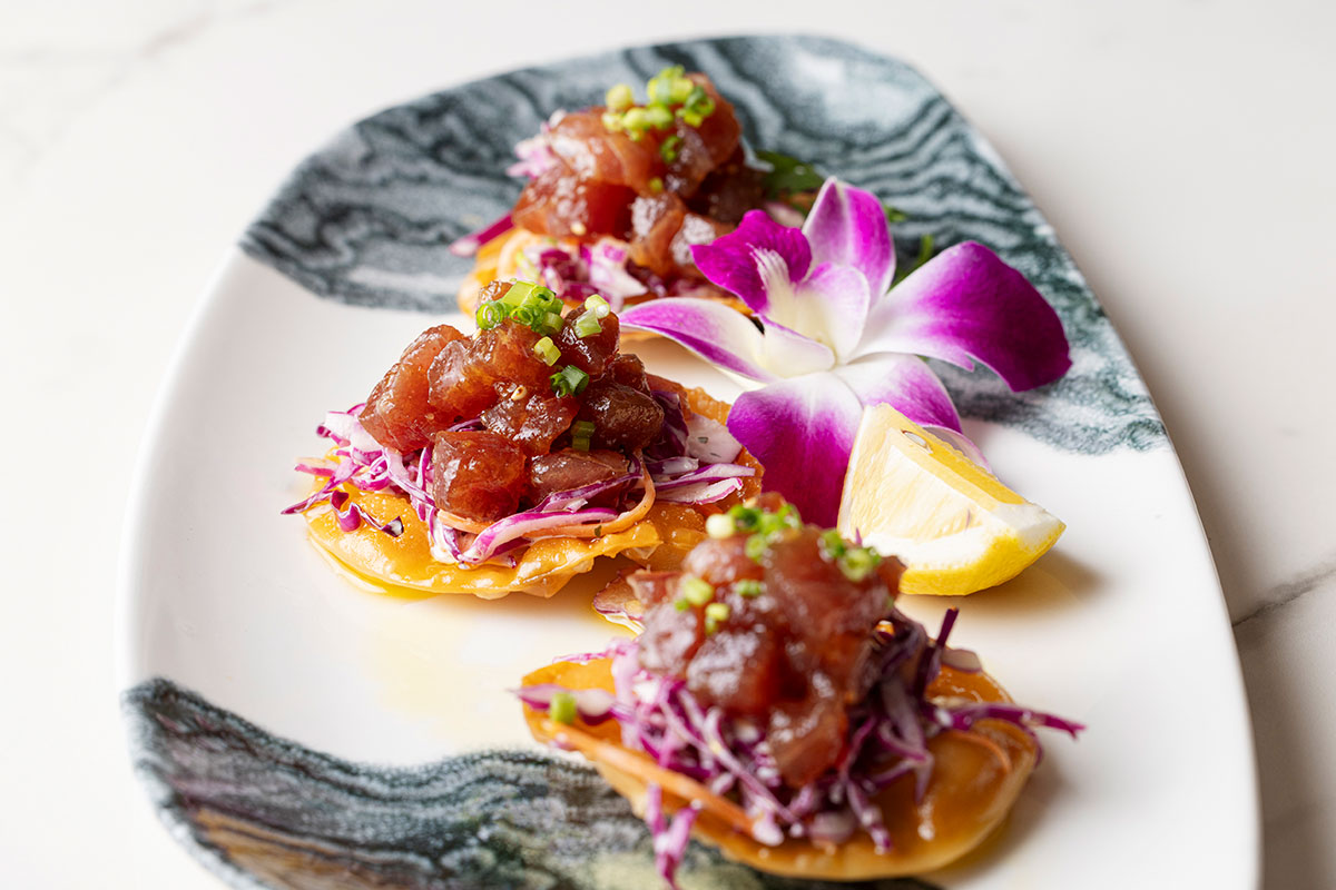 部下との会食なら、話題のスポットで気分を上げながら美味しい時間を共有してみては。今ならぜひ、渋谷の新名所「代々木公園 BE STAGE」へ。スケートボードやアートなど多彩なアクティビティが楽しめる施設。ここにワイキキ発の人気店が上陸!ハワイらしいゆったりとした空気感が漂い、緊張気味の部下もリラックスするはずです。テーブル間もゆとりがあり、隣席を気にせず会話ができるのも魅力。料理は、本場ハワイの味が楽しめるパシフィック・リム。本店のシグネチャーはもちろん、トーキョー限定のメニューもラインナップ。こちらはアラカルトもよいですが、コース料理の満足度も高め。4名以上なら、ドリンク付き7、500円の「Tiki’s ShareStyle」がおすすめです。人気メニューをシェアしながら、ドリンクは飲み放題。“2時間制”という時間制限も、部下を拘束しすぎないスマートな配慮に!