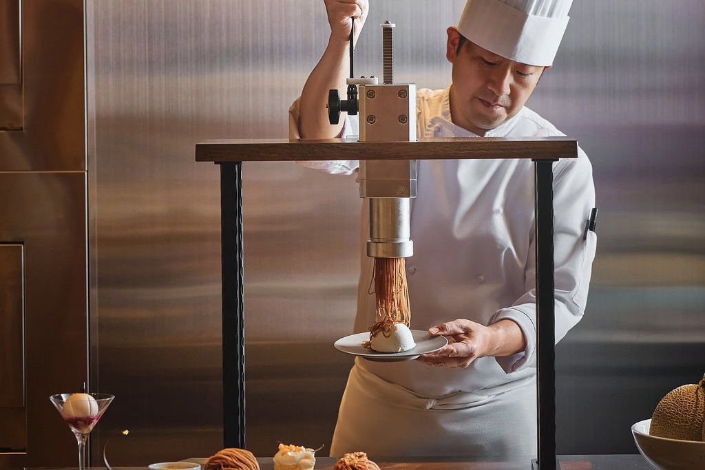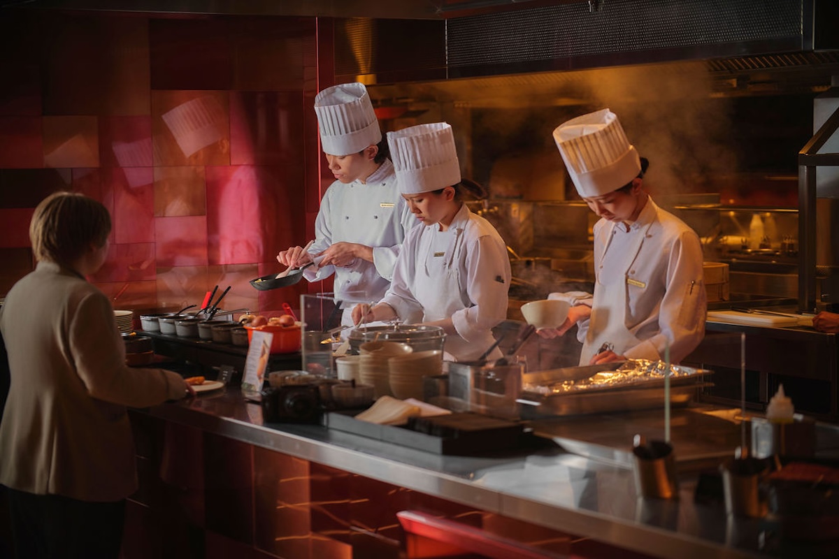 ホテルのロビーフロントにある「クロスロードキッチン」は、シェフが目の前で仕上げる出来立ての一皿をゲストが自由にピックアップできる“ライブ感あふれる”新感覚のビュッフェスタイル。豊富なメニューを好きに食べられる自由さと、ホテルダイニングの贅沢さを融合させた革新的な体験が、食にこだわる人々の心を掴んでいます。