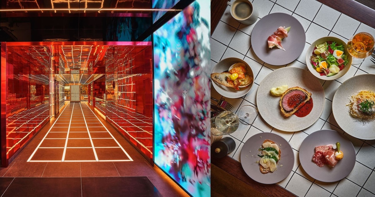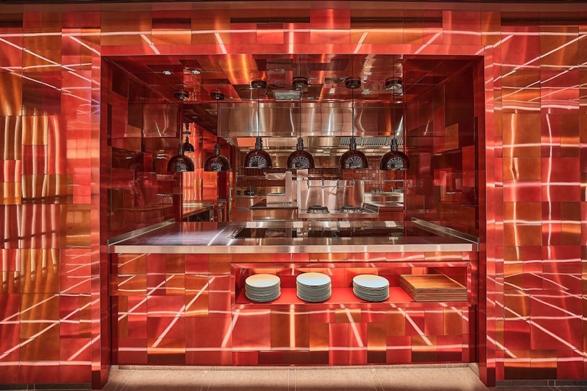 レストランは活気あふれる近未来的なライブキッチンと、緑豊かでシックな雰囲気のダイニングに分かれた2ゾーン構成。その間をつなぐ通路には「LEDアートウォール」が設置され、新宿のネオン街や錦鯉などの映像と音楽が連動する幻想的な仕掛けが、行き交うゲストを非日常の世界へと誘います。