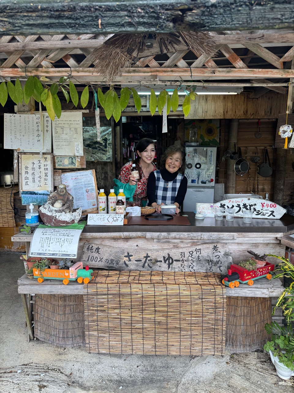 ここからは「UMUI YAA」滞在中に訪れたい周辺のおすすめスポットをご紹介。料理家でもある杉山さんがまず挙げたのは、こちらの搾りたてサトウキビジュース「さーたーゆー」のお店。地元の“おばあ”が長年営む素朴なジューススタンドです。「さーたー」=砂糖、「ゆー」=お湯(汁)を意味し、このジュースを煮詰めると黒糖になります。甘味だけでなくサトウキビのミネラル分がそのままたっぷり含まれたフレッシュジュースは栄養価も高く、しかも自分で絞らせてくれるなんて、忘れられない体験になりそう。