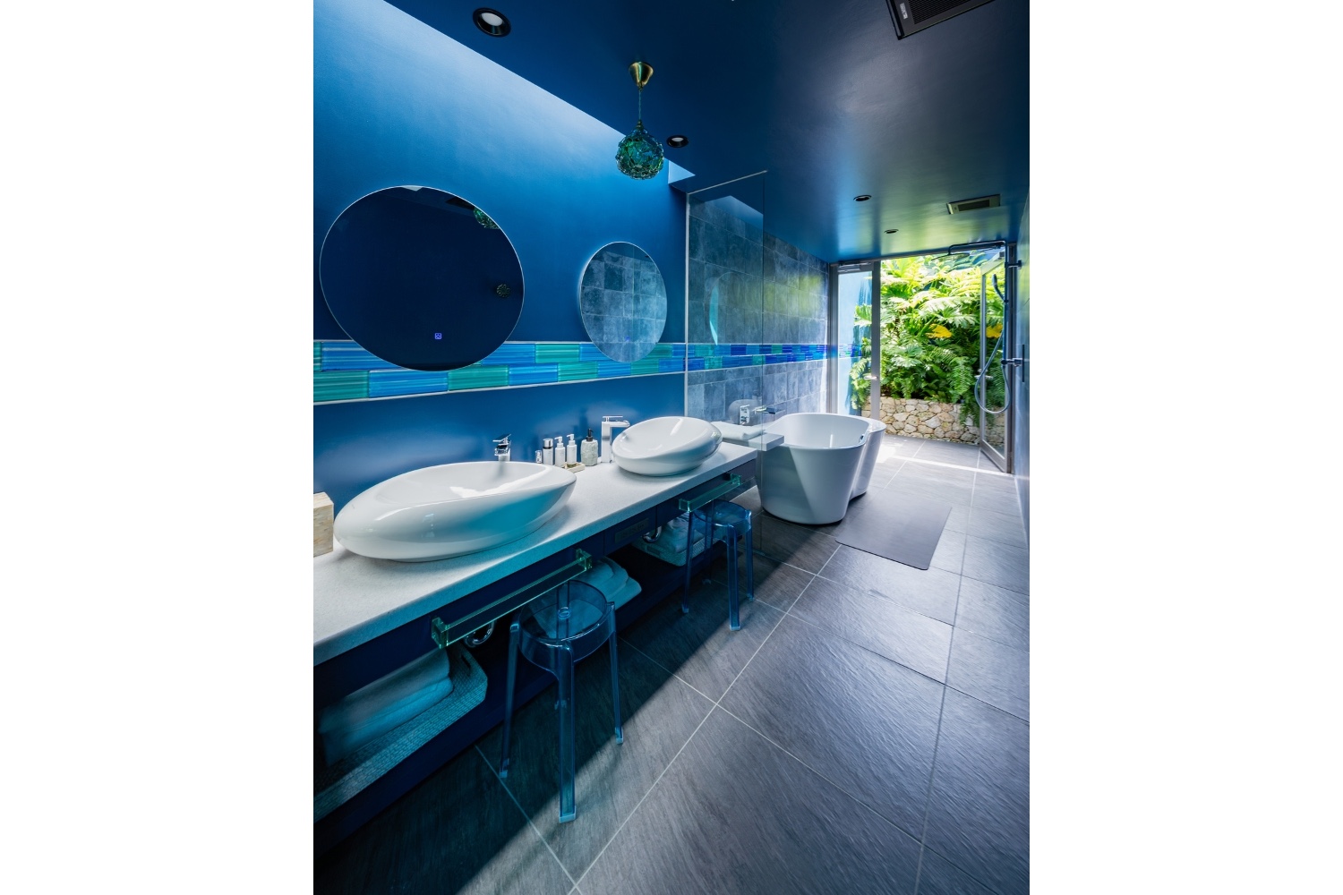 「那覇空港からのドライブも楽しく、ランチやビーチに寄り道しながら、ヴィラまであっという間に到着。レンタカーがなくてもタクシーやハイヤーで行けます。沖縄伝統の装飾がほどこされた白いエントランスから、もうワクワクが止まりません。扉を開けるとシーサーがお迎え。宮本亞門さんがこだわった、現代的な沖縄の芸術と温かみのある伝統の手仕事が調和した空間は本当に美しく、ウェルカムティーやスイーツなど、いたるところにヴィラのオーナー KYOTAさんによるおもてなしがあります。趣の異なる3つの棟は、それぞれの魅力を楽しめるすべてが心地いい空間。そして海が信じられないほどきれい!空が広い!夕焼けが感動的!星がロマンティック!入り江から海に入ると、都会の喧騒もすべて忘れてリフレッシュできます。仕事やプライベートでモヤモヤしたことがあったとしても一瞬で忘れてしまう、魔法みたいな場所です」
