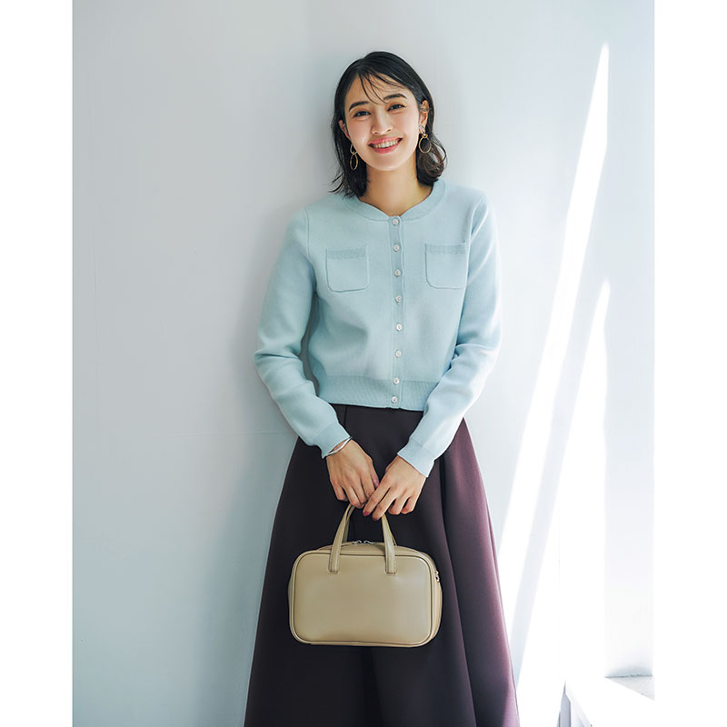 カーディガン¥15,300(ローブ ブラン)スカート¥10,990(アンフィーロ)バッグ¥45,100(ロー ソウル)イヤリング¥6,820(イットアトリエ╱フォーティーン ショールーム)バングル¥36,300(エムシー・スタジオ╱ZUTTOHOLIC)