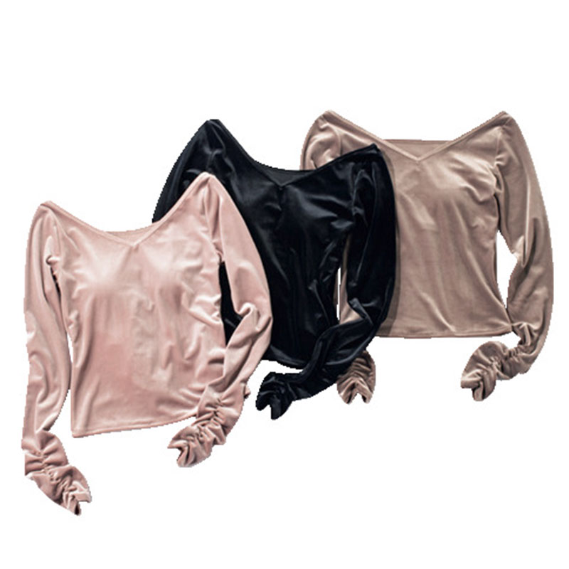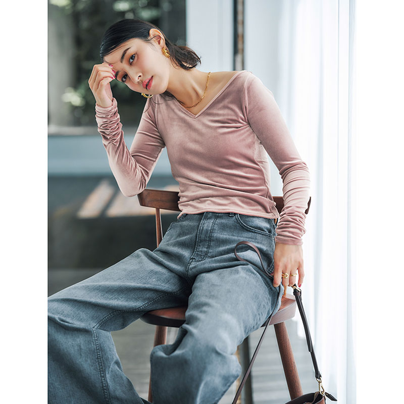 ほどよい光沢感のあるストレッチベロア素材を使用。大きく開いたVネックでも、カップ付きでインナー選びに困らないのが嬉しい。水洗い可。