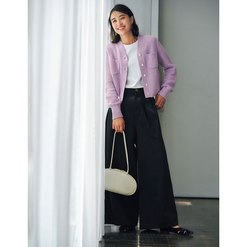 カーディガン¥14,300(ローブ ブラン)パンツ¥24,200(アルページュストーリー╱アルページュストーリー プレスルーム)バッグ¥35,200(ロー ソウル)パンプス¥22,000(オゥ バニスター╱アバハウスインターナショナル オンラインストア)カチューシャ¥9,350(ジャルダン ドゥ シュブー)イヤリング¥6,820(イットアトリエ╱フォーティーン ショールーム)Tシャツ╱スタイリスト私物