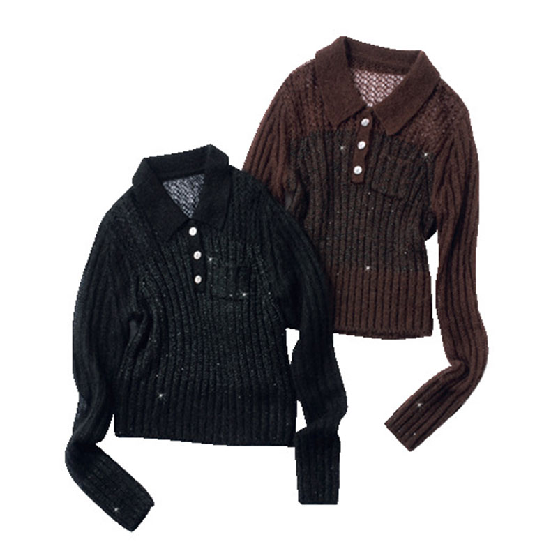胸上は透け感のある編み地、胸下はスパンコールを編み込んだリブ編みで切り替え。フロントには上品なツヤを放つ貝ボタンを使用。