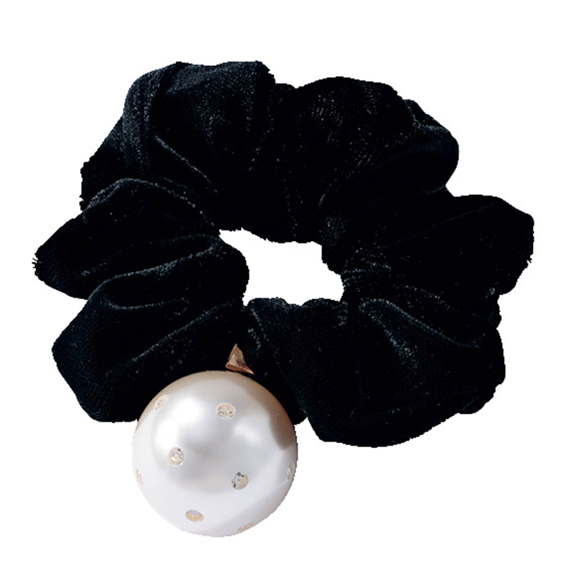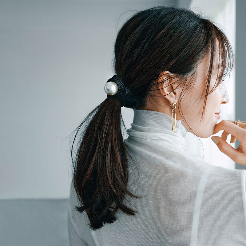 リッチなベロアシュシュに、ビジュー付きのビッグパールがアクセント。太すぎず細すぎない布幅で、オフィスや学校行事にも違和感なくマッチ。
