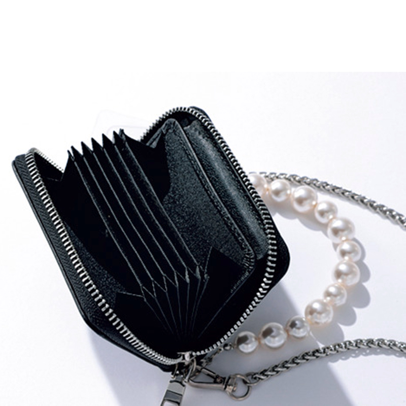 本革にビジューをあしらった高級感たっぷりなミニウォレット。パール&チェーンのストラップ2種とスマホホルダーはそれぞれ取り外し可能。