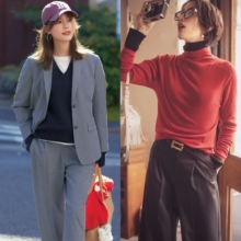 ニット¥13,200(ブラン)カットソー¥18,700 デニムパンツ¥31,900(ともにヤヌーク/カイタックインターナショナル)バッグ¥43,500(トゥティエ)パンプス¥26,400(ツル バイ マリコ オイカワ)ピアス¥8,580(ピルグリム/ZUTTOHOLIC)