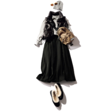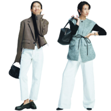 ジャケット¥10,780パンツ¥11,000(ともにユニバーサル オーバーオール)ニット¥11,000(ジャスグリッティー/ジャスグリッティー プレスルーム)バッグ¥23,100(マニプリ)ブーツ¥28,600(ダイアナ/ダイアナ 銀座本店)イヤリング¥8,800(アビステ)