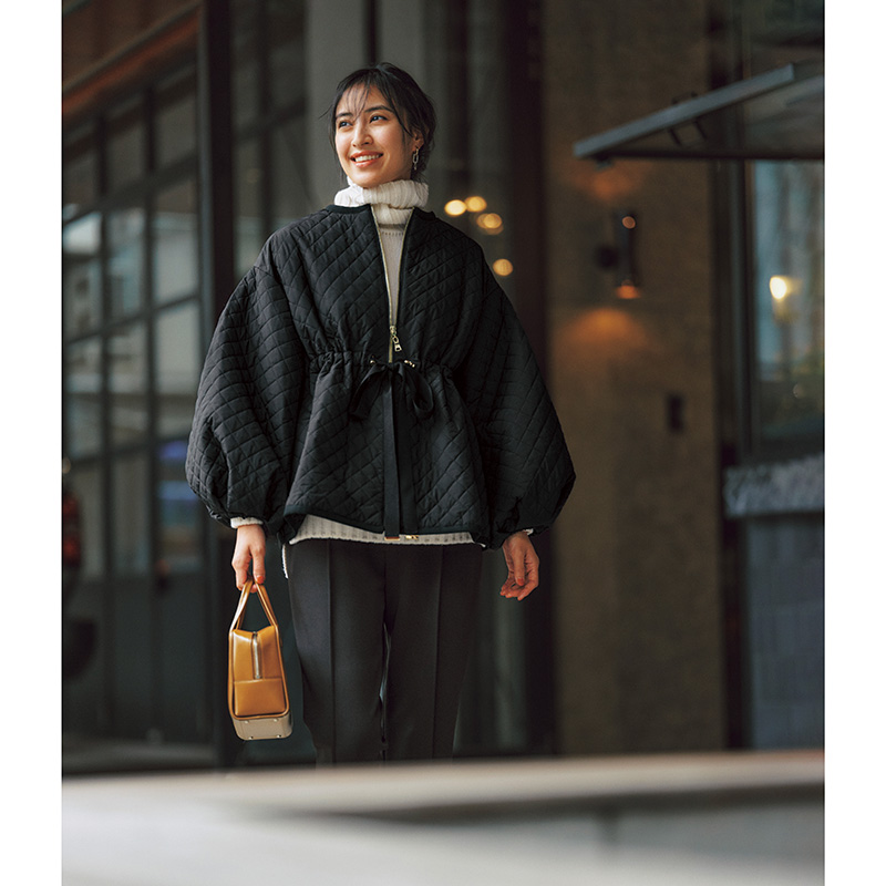 撥水キルティング素材に、着膨れしない高保温機能のある中綿をIN。ノーカラーで上品にまとまり、ウエストはグログランテープで好みのシルエットに調整可能。
