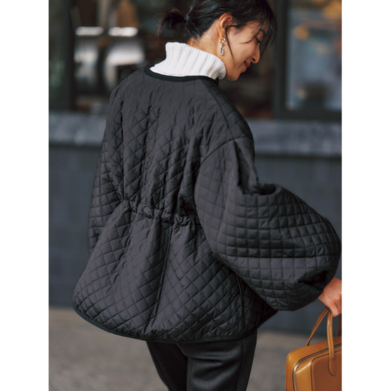 バルーン袖で厚手ニットの上からも難なく羽織れる仕様。スポーティに見えがちなキルティングアウターを、袖の丸みやノーカラーのクリーンさで「きちんと見え」「上品見え」に昇華。高め位置で絞れるウエストはスタイルアップ効果抜群で、デニムにもキレイめパンツにも好相性。撥水素材だから雨の日の送迎から、ちょっぴり煌めきたいママ友ランチまで、軽やかにフィット。ゴールドジップが冬の装いに華やかさを添えます。