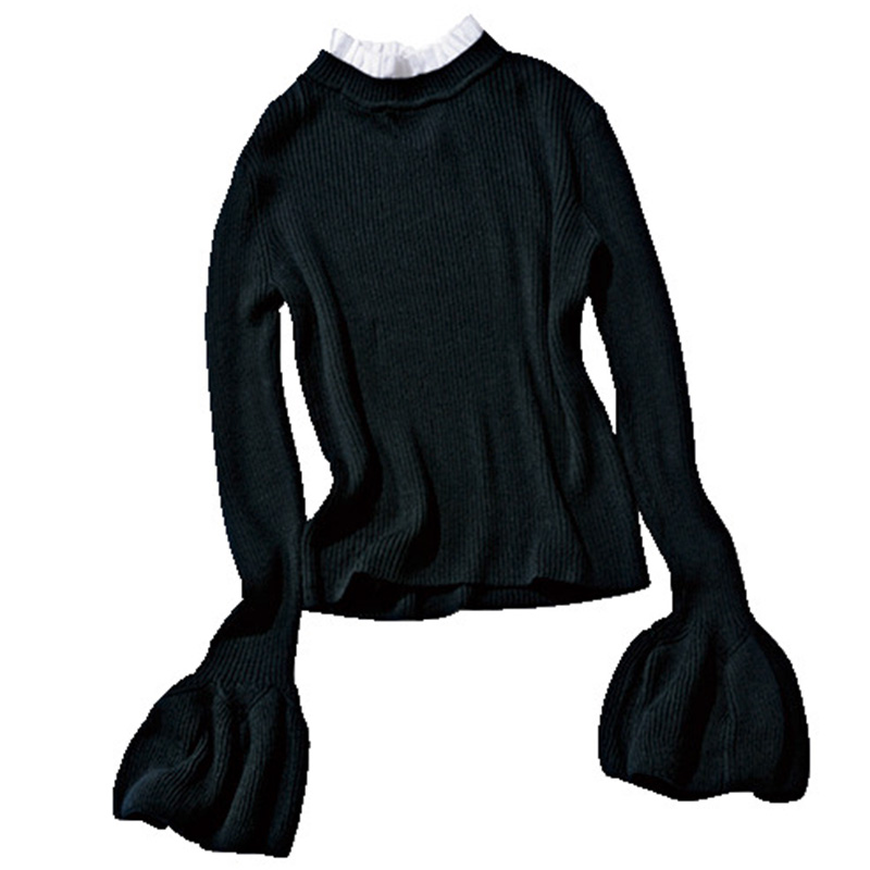 フリル衿は取り外し可能。2WAYで楽しめるウォッシャブルニット。白衿はシャツ重ね風の端正さを演出。袖口はフレアで華やか。ふっくらスポンディッシュなリブ編みで着心地も快適。