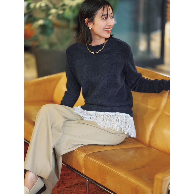 カジュアルになりがちな冬のデニムコーデも、レース付きニットを合わせるだけでぐっと上品な印象に。気になるお腹&お尻もさりげなくカバーしてくれるのが嬉しいポイント。きれい派ママにもおすすめの1枚です。