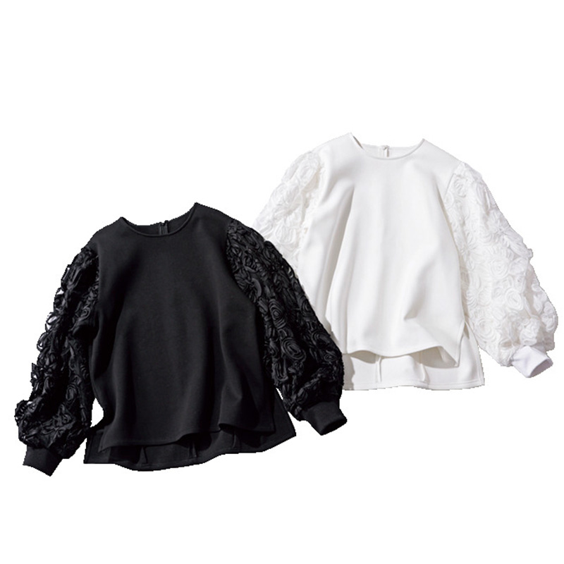 蓄熱する裏起毛の肉厚カットソーで、軽いのに真冬も暖かく着られる一枚。袖にはフラワーチュールレースを重ねて華やかに。レースの透け感がありつつ、袖まで裏起毛という珍しい仕様。