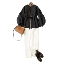 ウエストベルト付きのオールインワンは、実は着こなし次第でカジュアルシーンにも活躍する優秀アイテム。タートルをインナーに仕込み、足元はスニーカーで外せば、抜け感のあるきれいめカジュアルが完成。アウターには動きやすいジレタイプを。週末の子どもとのお出かけも気負わずに過ごせて、上品さもキープできるのがうれしい。