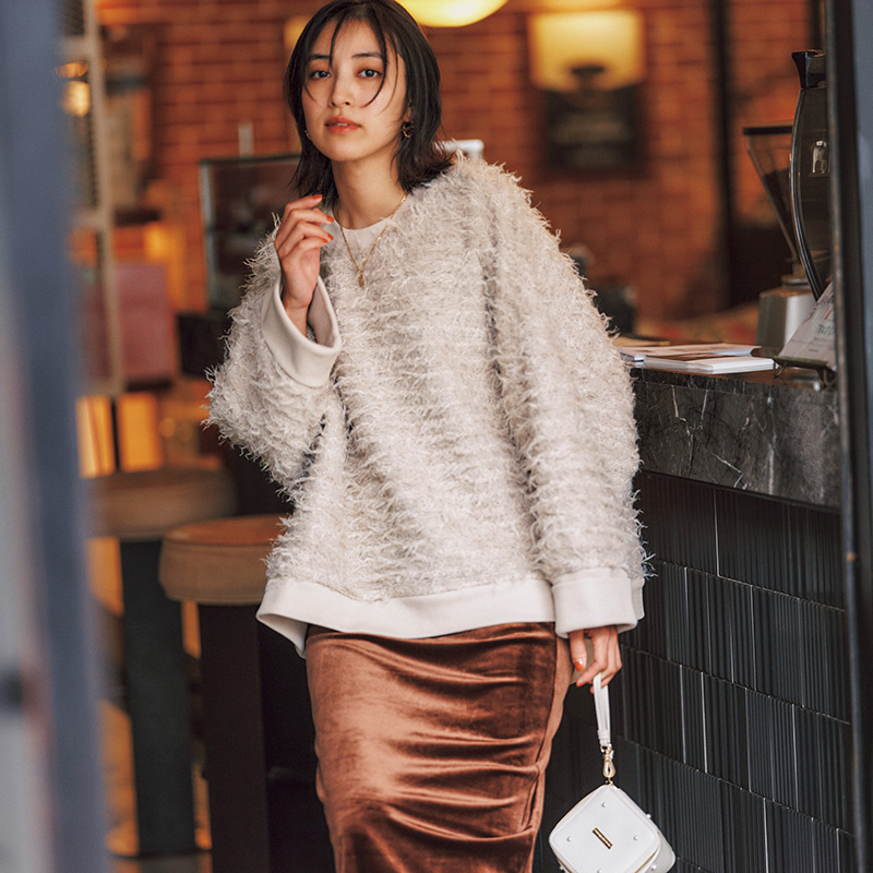 冬の街にリッチ感を添えるベージュ。シャギーのフサフサした質感で華やかさがありつつ、オーバーサイズのシルエットが抜け感を演出。パンツだけでなく、Iラインスカートとも好相性で、大人のホリデースタイルに。