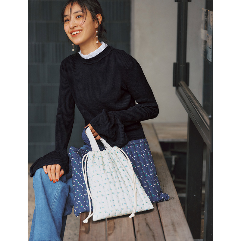 ニット¥9,900 レッスンバッグL¥5,500 シューズバッグ¥3,500(すべてアジュガ)パンツ¥30,800(ヤヌーク╱カイタックインターナショナル)ピアス¥16,500(ミキア)