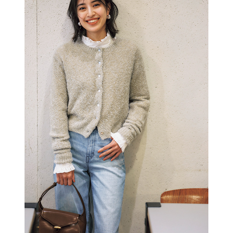 肌触りにこだわったナイロン混のラメニット。クルーネック×前開きで、羽織りにもトップスにも使えるのが魅力。手洗い可。